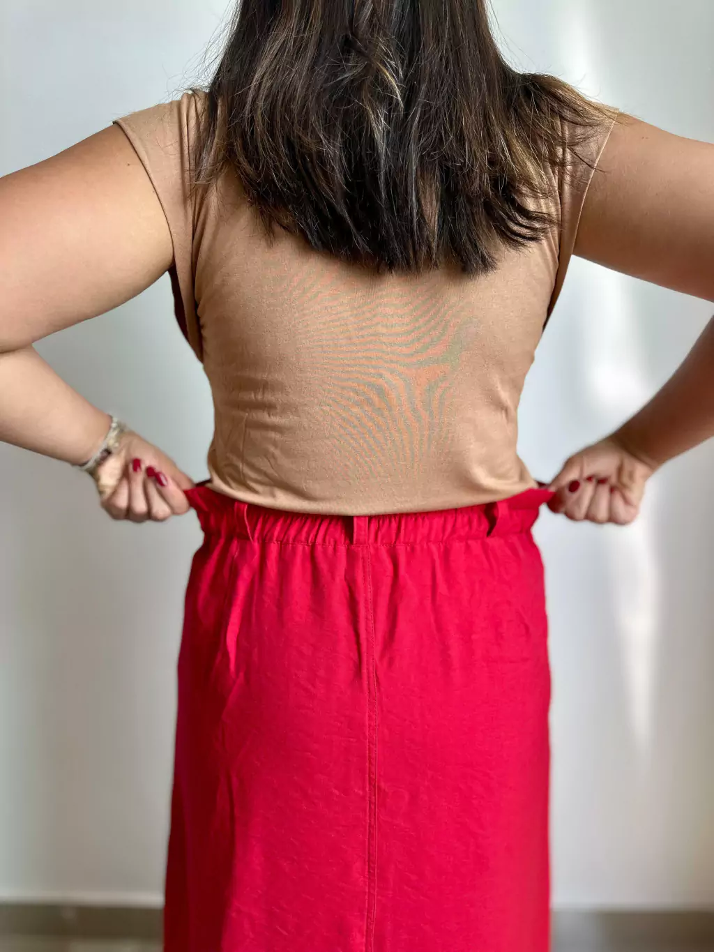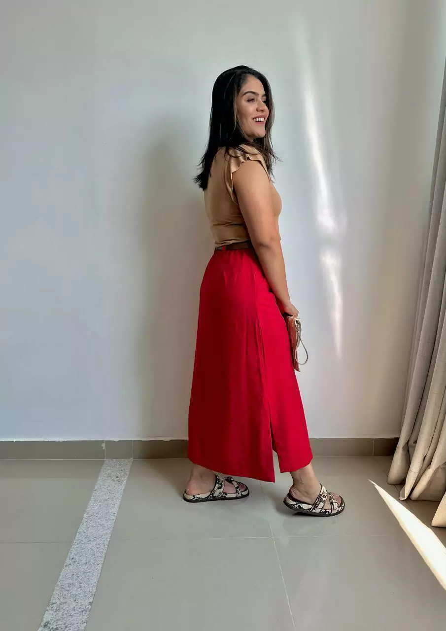 Saia produzida na viscose sensoriale, possui bolsos, fendas nas laterais e elástico na parte de trás para trazer mais conforto.