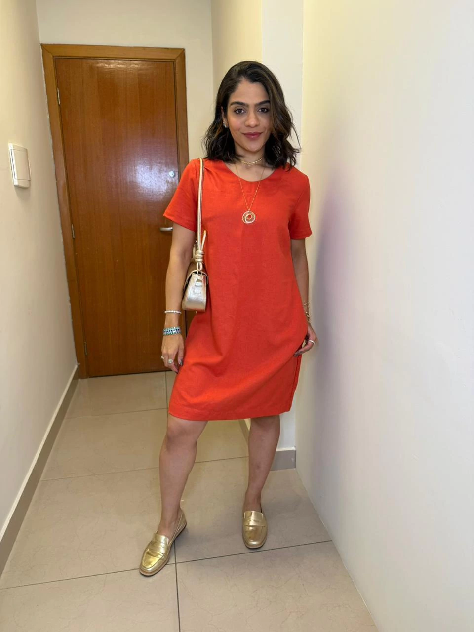 Um vestido de linho misto, fresco e macio. Possui bolsos frontais e botão na parte de trás, facilitando na hora de vestir.
